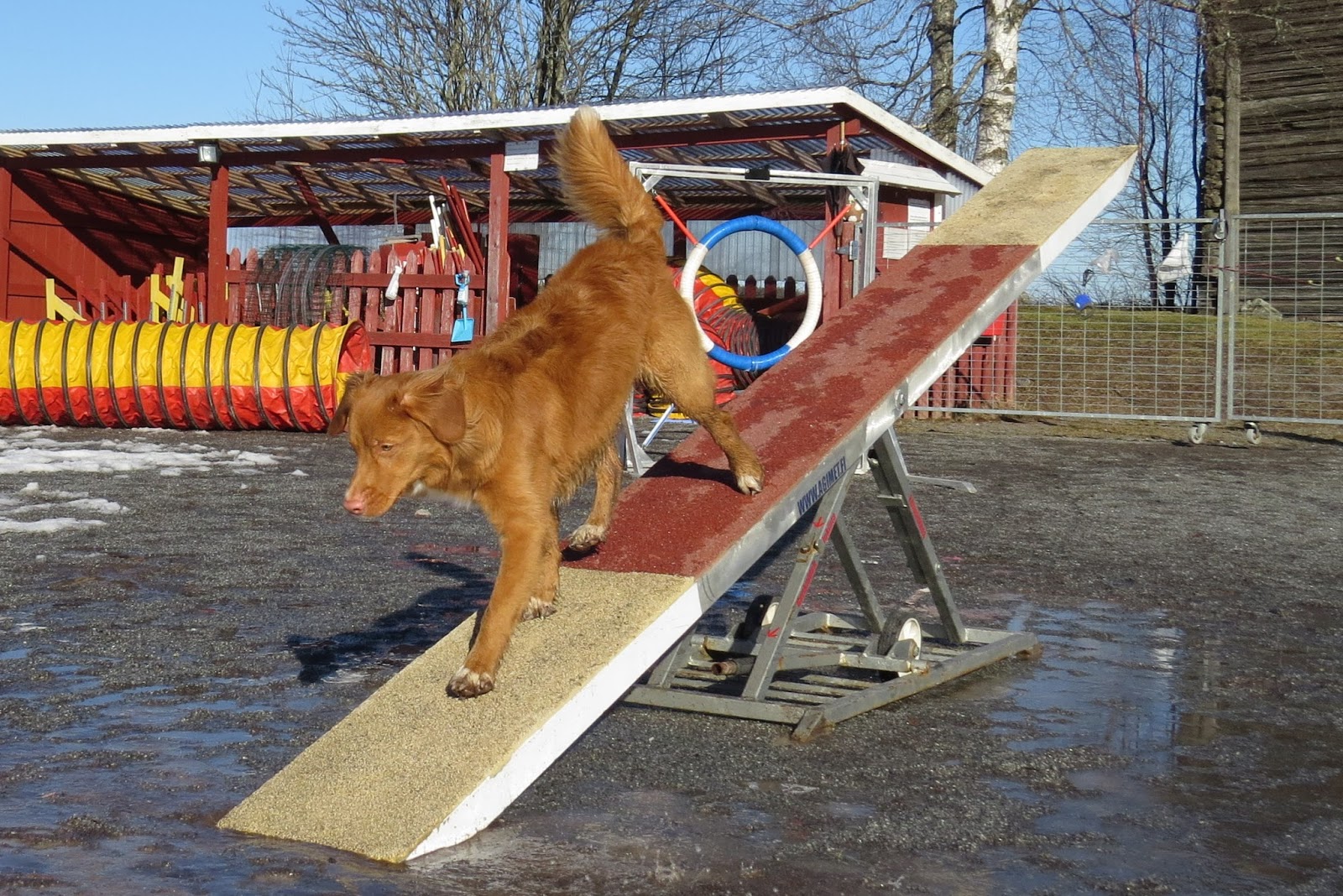 Tänään Anna ja Sara kävivät Valtin kanssa tutustumassa agilityn alkeisiin Woffin kentällä Vöyrillä. Alla muutama kuva ensikokeiluista. :)